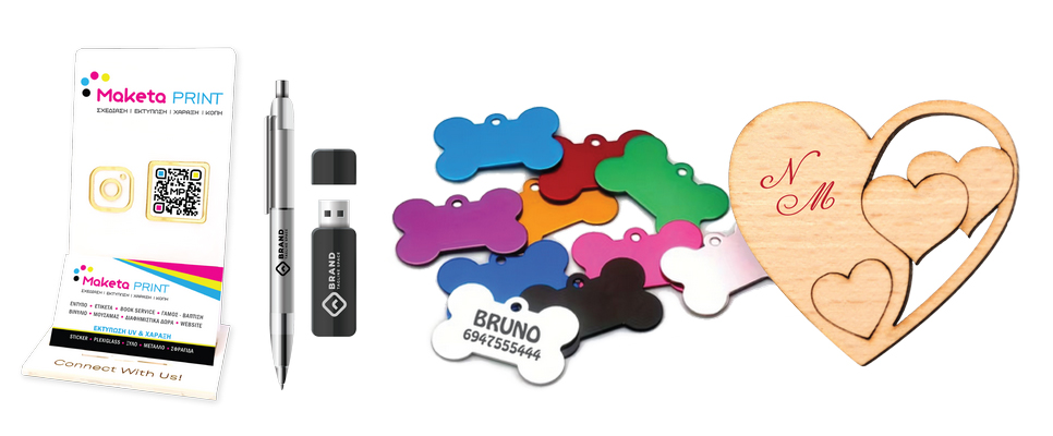 Εκτύπωση UV, κοπή και χάραξη σε υλικά όπως plexiglass, ξύλο, μέταλλο, πέτρα, πορσελάνη, μάρμαρο, χαρτί κ.α.